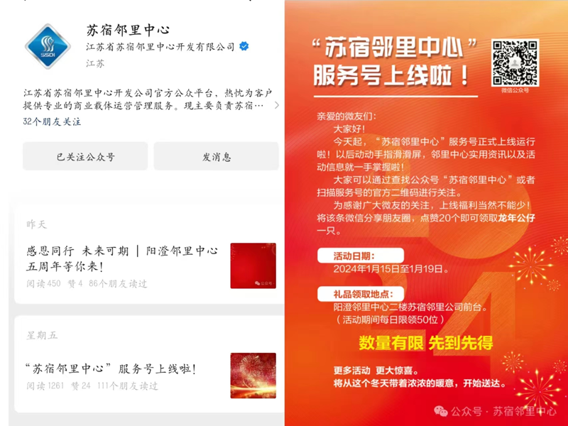 “蘇宿鄰里中心”服務(wù)號(hào),是蘇宿鄰里公司官方賬號(hào),旨在構(gòu)建社群關(guān)系、活動(dòng)宣傳、商鋪招租及有關(guān)政策等方面提供最新資訊,讓載體變得有溫度起來。